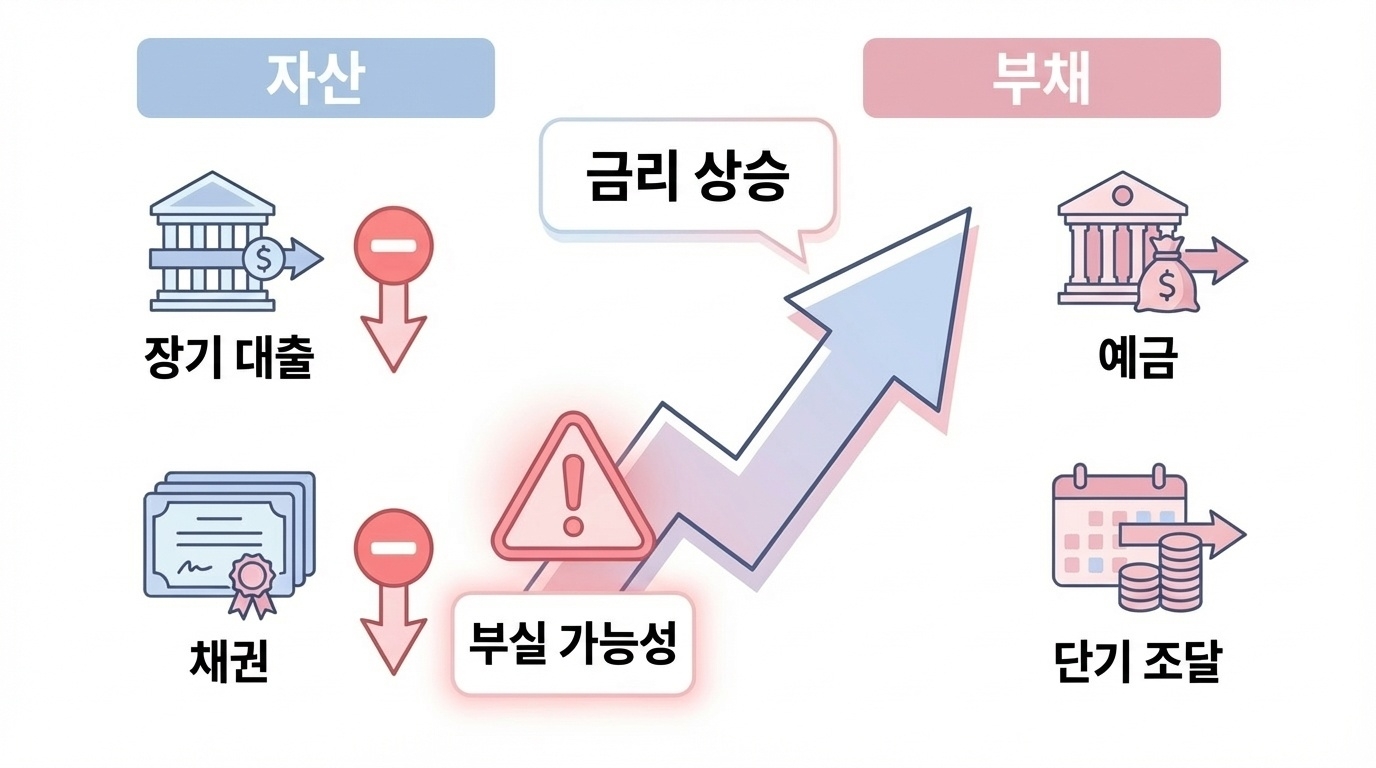 은행 부실의 시작점은 단순히 “돈을 못 벌어서”가 아니라, 자산과 부채의 만기 미스매치에서 출발합니다. 은행은 장기 대출과 채권에 돈을 빌려주고, 단기 예금으로 자금을 조달하기 때문에 금리가 급격히 오르거나 경기 침체가 길어지면 자산 가치가 흔들릴 수밖에 없습니다.