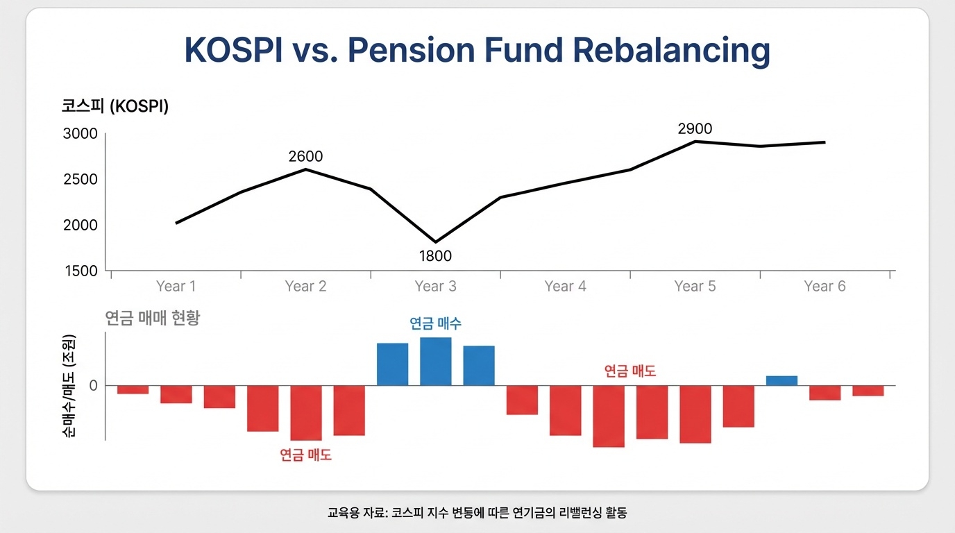 연금은 장기적으로 목표 수익률과 자산 비중을 맞춰야 하는 리밸런싱 플레이어입니다. 지수가 일정 구간 이상 오르면 주식 비중을 줄이고, 빠지면 다시 담는 구조죠. 문제는 이 과정이 개인 투자자가 체감하기에는 “상승장에서 꼭 윗머리를 치는 매도”처럼 보인다는 점입니다.