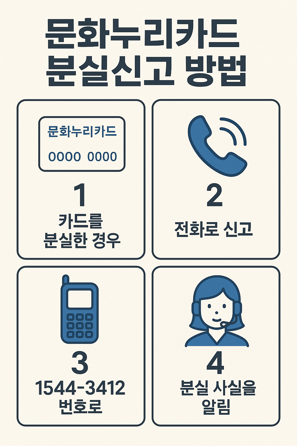 문화누리카드를 분실했다면 즉시 분실신고를 해야 합니다. 온라인으로는 문화누리카드 홈페이지에서 24시간 신고 가능하고, 전화로는 1544-3412로 연락하면 됩니다. 주민센터나 읍면동 행정복지센터에 직접 방문해서 신고할 수도 있습니다.