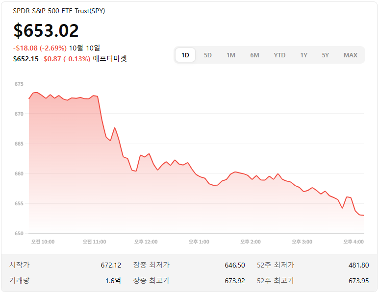 미국 주식이 급락할 때 떠오르는 여러 생각과 시각을 아래와 같이 정리해 보겠습니다. (참고로, 현재 SPDR S&P 500 ETF (SPY) 가격은 약 653.02 USD, 전일 대비 약 –2.7% 하락 중임.