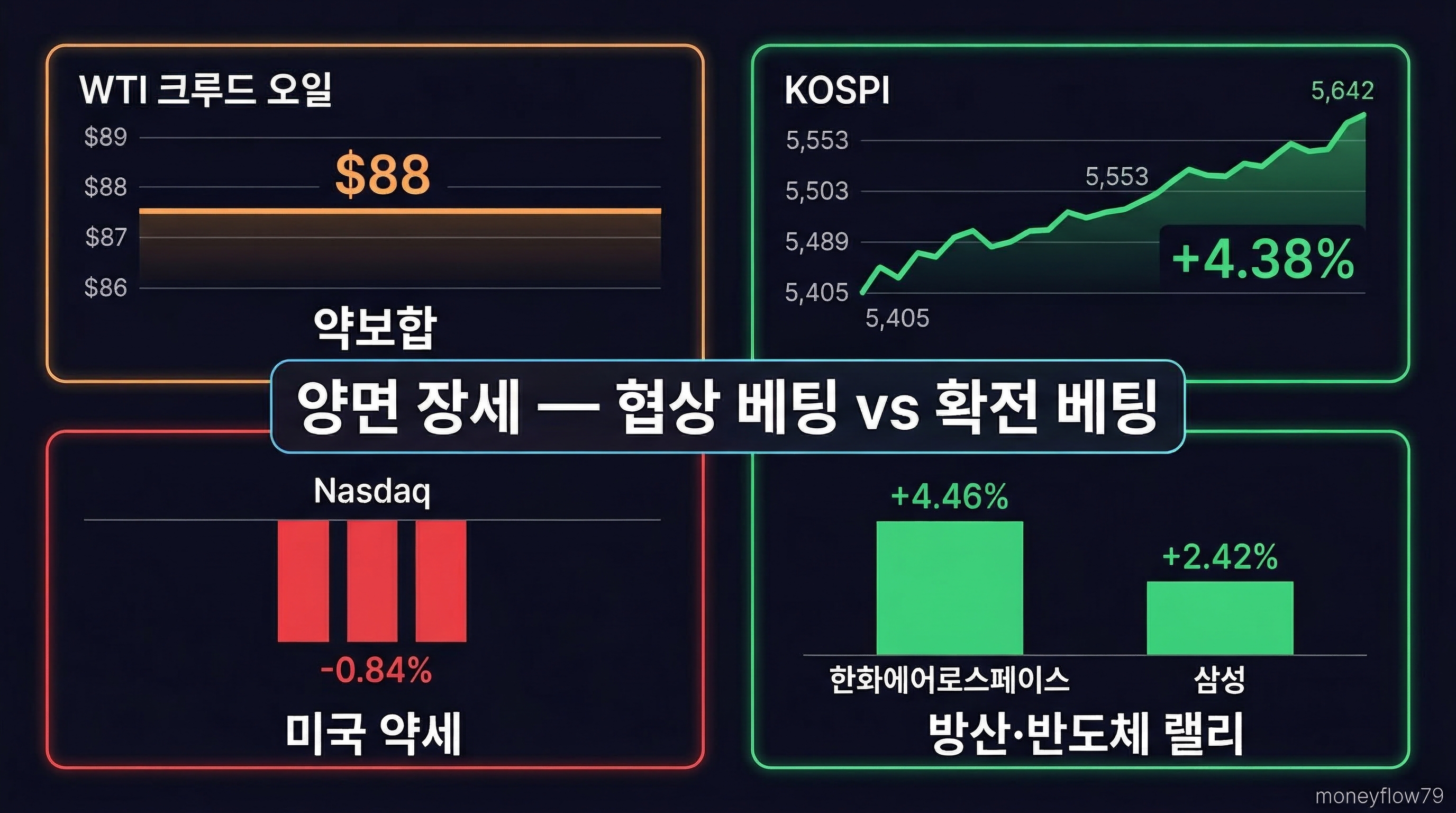 결국 오늘 시장의 메시지는 명확하다. 반도체·수출주는 "유가 하락 → 경기 방어"에 베팅하고, 방산주는 "협상 결렬 → 확전"에 베팅한다. 두 가지 시나리오가 동시에 가격에 반영되는 극단적 양면 장세다.