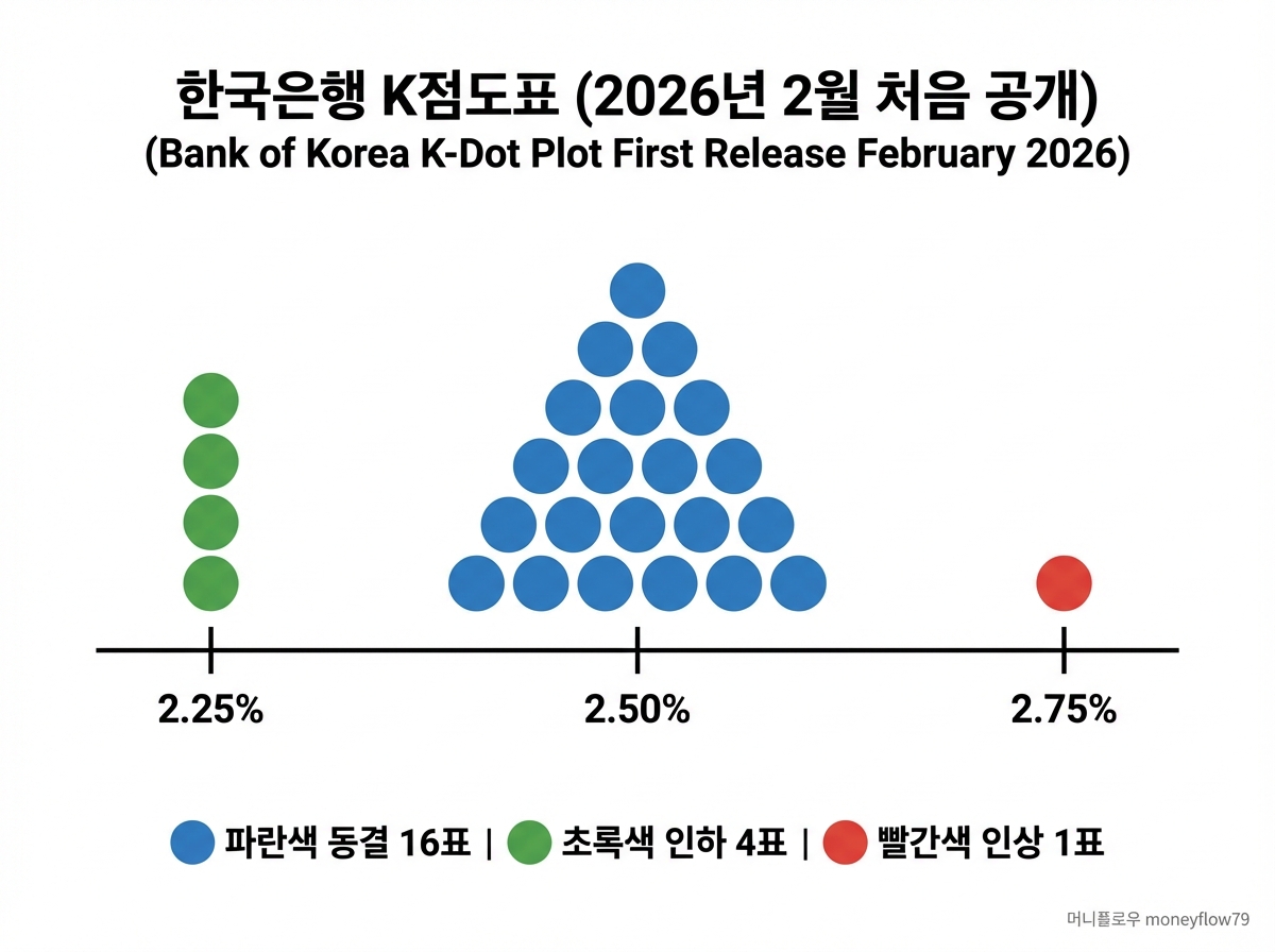둘째, K점도표 첫 공개. 한은이 처음으로 미국 연준(Fed)의 점도표(dot plot)와 유사한 'K점도표'를 공개했습니다. 금통위원 7명이 각각 6개월 후 기준금리 전망을 3개씩 제시해 총 21개의 점이 찍혔는데, 16개(76.2%)가 현 수준인 2.50% 동결, 4개가 2.25%(인하), 1개가 2.75%(인상)에 찍혔습니다. 전반적으로 인상보다 인하 가능성을 더 열어둔 구조이지만, 이창용 총재는 "3개월 내 인상 논의는 없다"고 못 박았습니다.