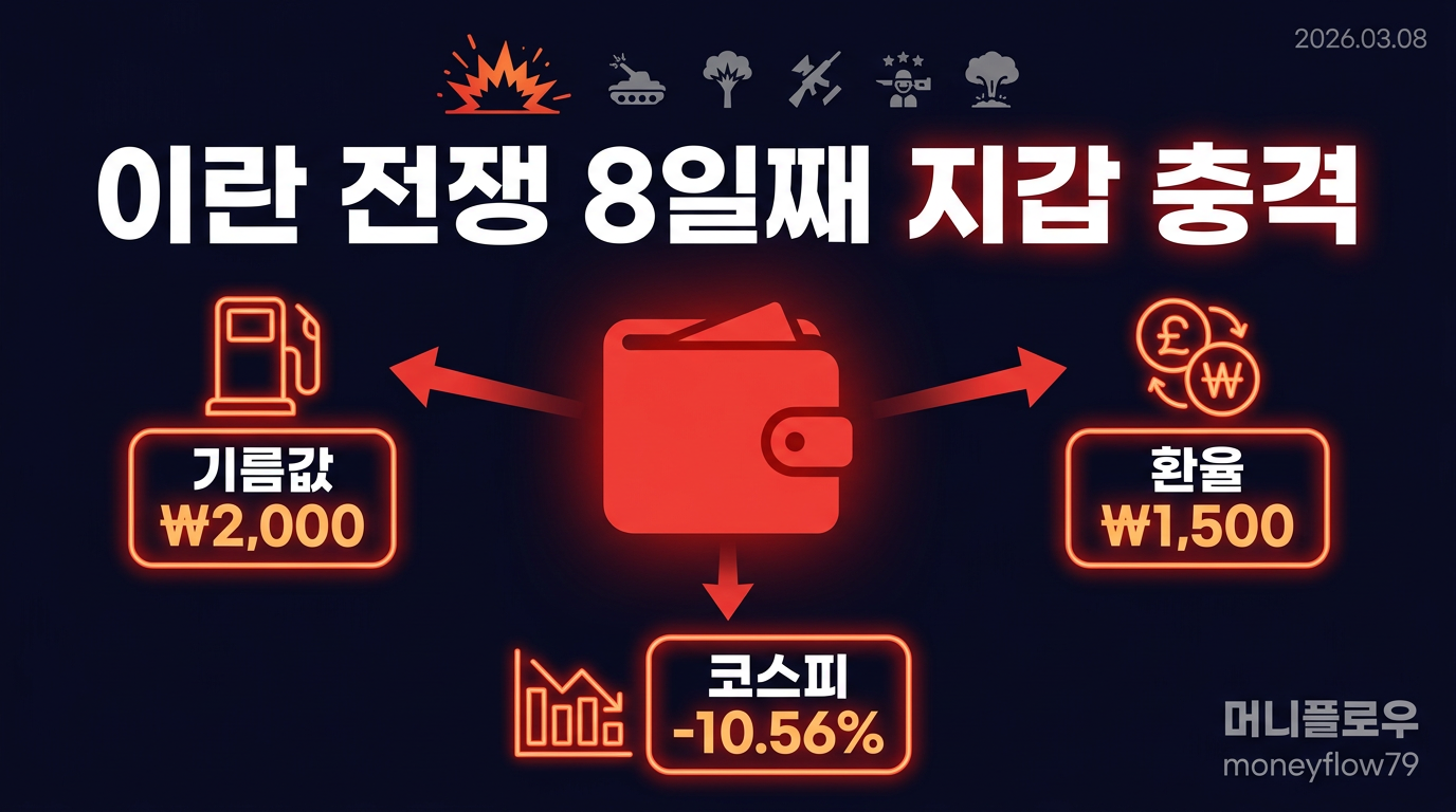 이란 전쟁 8일째, WTI 90달러(주간 +36%), 전국 주유소 휘발유 1,889원(서울 2,000원 목전), 원/달러 환율 1,500원 돌파. 기름값·환율·물가가 내 지갑에 미치는 3대 충격과 지금 당장 실행할 생존 대응법 7가지(주유 전략, 환전 타이밍, 장보기 팁, 투자 포지션, 대출 점검, 비상금 확보) 긴급 정리.