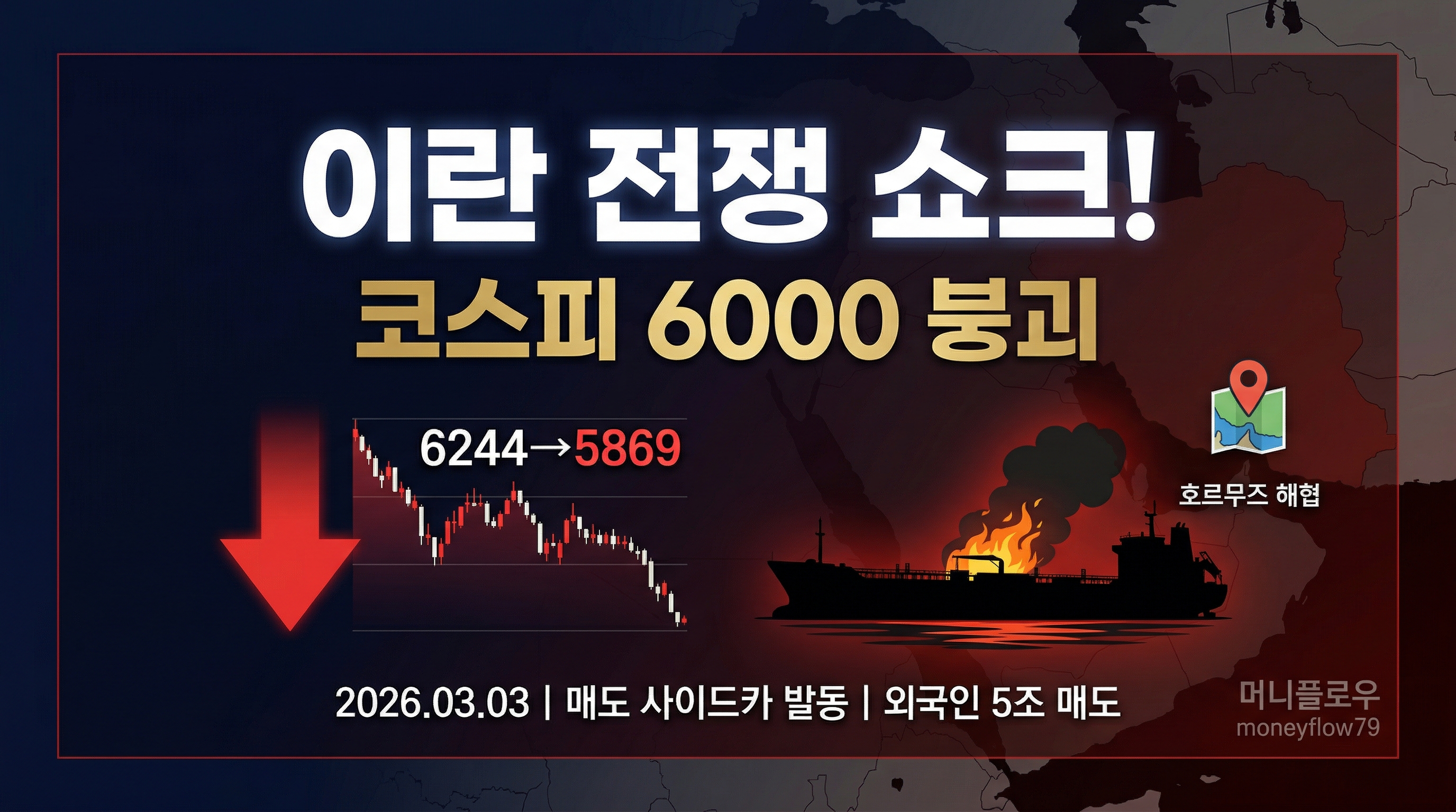 이란 전쟁 첫 거래일인 3월 3일, 코스피가 6000선 아래로 붕괴되고 매도 사이드카가 발동됐습니다. 외국인 5조원 매도 폭탄에 삼성전자 -8%, SK하이닉스 -8% 급락. 반면 한화에어로 +20%, LIG넥스원 상한가. 호르무즈 봉쇄·유가 급등·환율 폭등 속 지금 해야 할 5가지 긴급 투자 체크리스트를 정리합니다.