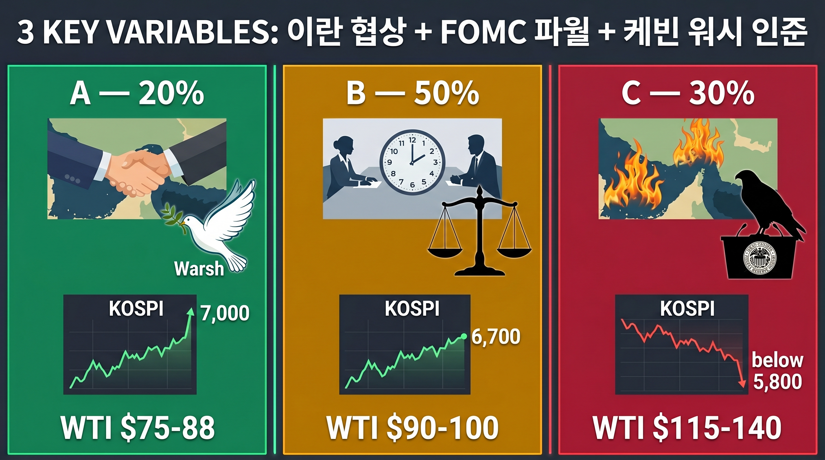※ 전주 대비 변동: 코스피 사상 최고(6,615) 달성으로 시나리오 A·B의 코스피 상단 전반 상향. 케빈 워시 인준 청신호로 시나리오 A 확률 소폭 상향(15%→20%). 이란 신규 협상안 제시로 C 확률 소폭 하향(35%→30%).