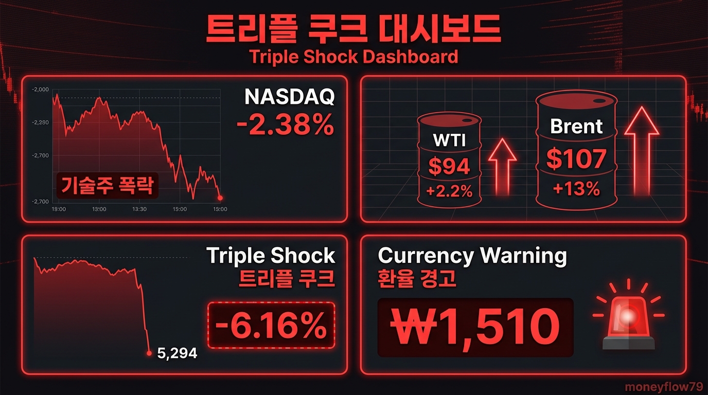 3연타 악재 — ① 트럼프 데드라인 4/6 재연장 ② 구글 터보퀀트 메모리 쇼크 ③ WTI $94·브렌트 $107 급등. 코스피 5,200대 급락. ⓒ mococo79