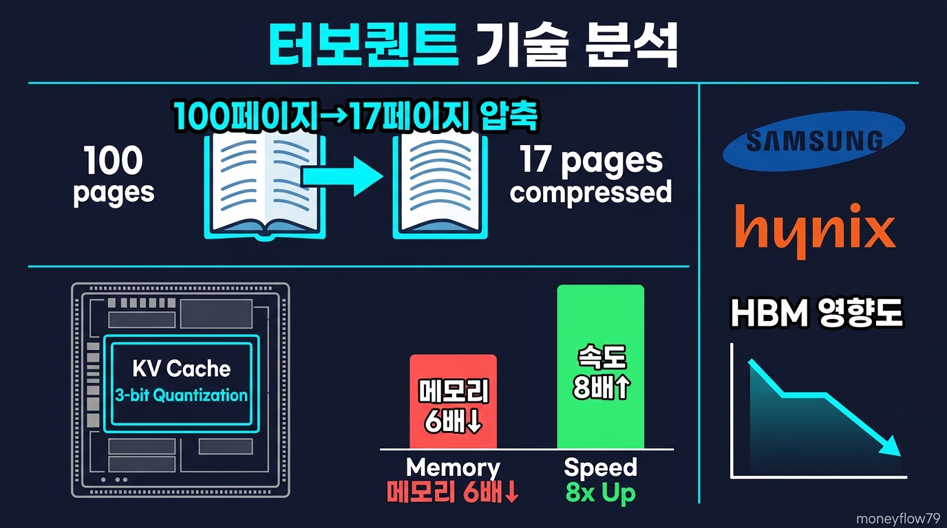 구글 리서치가 3월 24일(현지시간) 공개한 '터보퀀트(TurboQuant)'는 AI 거대언어모델(LLM)이 추론 시 사용하는 KV캐시(Key-Value Cache)를 3비트 수준으로 초압축하는 알고리즘입니다. 쉽게 말하면, AI가 긴 텍스트를 처리할 때 GPU 메모리(HBM)에 저장해야 하는 '작업 기억'을 정확도 손실 없이 6분의 1로 줄이면서, 처리 속도는 최대 8배 향상시킵니다. 조선일보는 이를 "100페이지 분량의 책 내용을 통째로 기억하는 대신 17페이지 요약본만 들고 다니면서도 동일한 수준의 답을 낼 수 있게 된 것"에 비유했습니다.