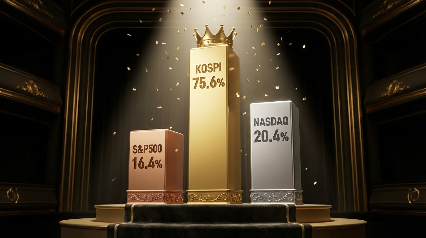 아닙니다. 2025년 코스피는 75.6%라는 경이적인 수익률을 기록했습니다. 같은 해 S&P500은 16.4%, 나스닥은 20.4%였습니다. 코스피가 미국 시장 수익률의 4~5배를 찍은 것입니다.