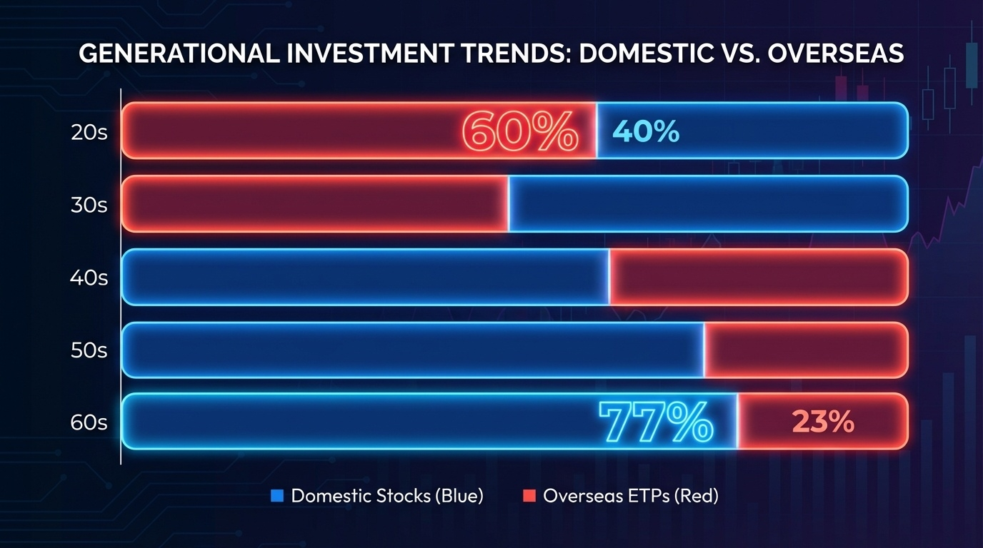 반면 60대 이상은 완전히 다른 그림입니다. 국내 주식 보유 비중이 76.99%에 달하고, 해외 ETP 비중은 12.79%에 불과합니다. 세대 간 투자 성향이 이렇게까지 극명하게 갈리는 것은 한국 증시 역사상 처음입니다.
