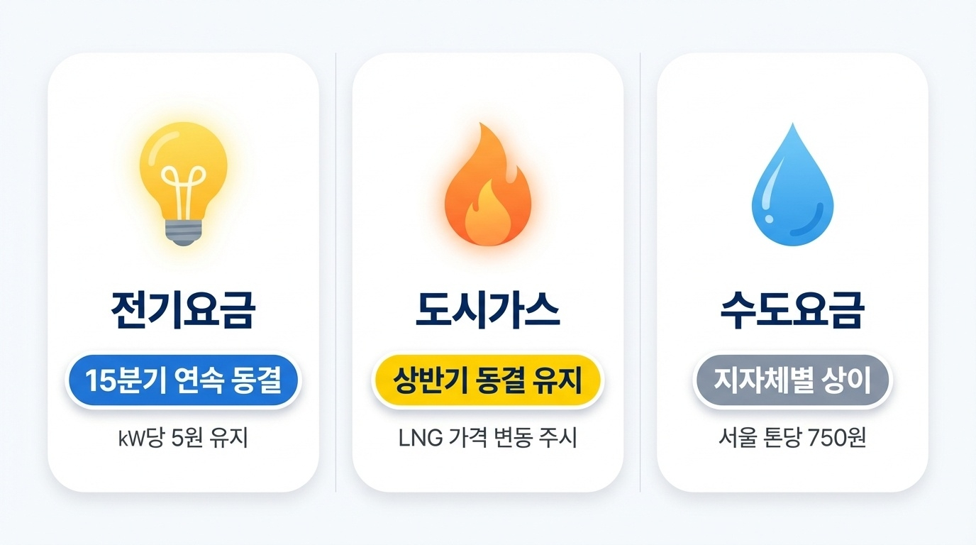 전기요금: 한국전력은 2026년 1분기 연료비 조정단가를 ㎾h당 5원으로 유지하면서 가정용 전기요금 15분기 연속 동결을 결정했습니다. 다만, 한전 누적 적자가 수조 원에 달해 하반기 인상 가능성은 열려 있습니다.
