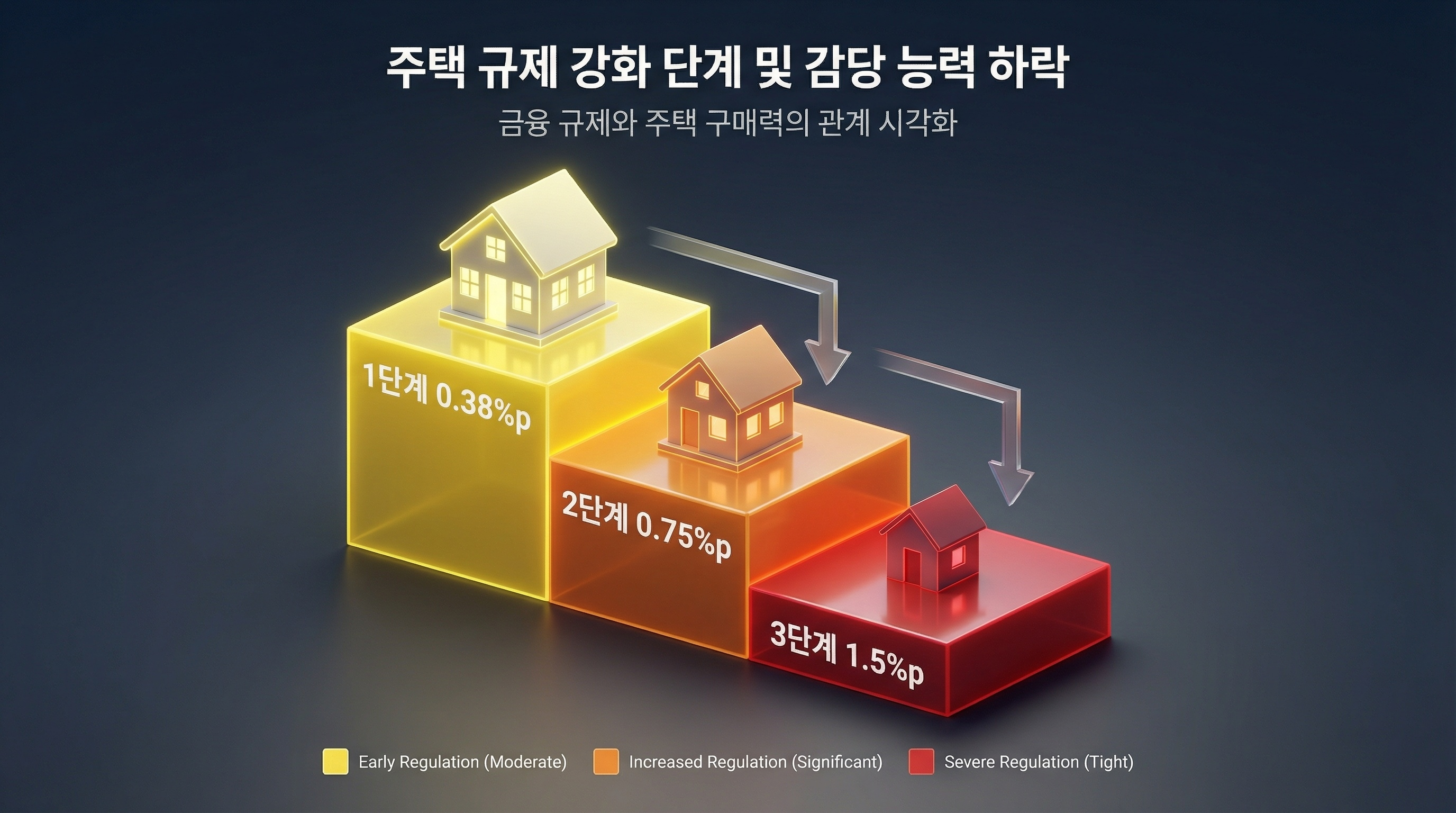 스트레스 DSR은 2024년 2월 1단계를 시작으로 단계적으로 강화되어 왔습니다. 현재 3단계가 시행 중이며, 규제의 '완성형'이라 불립니다.