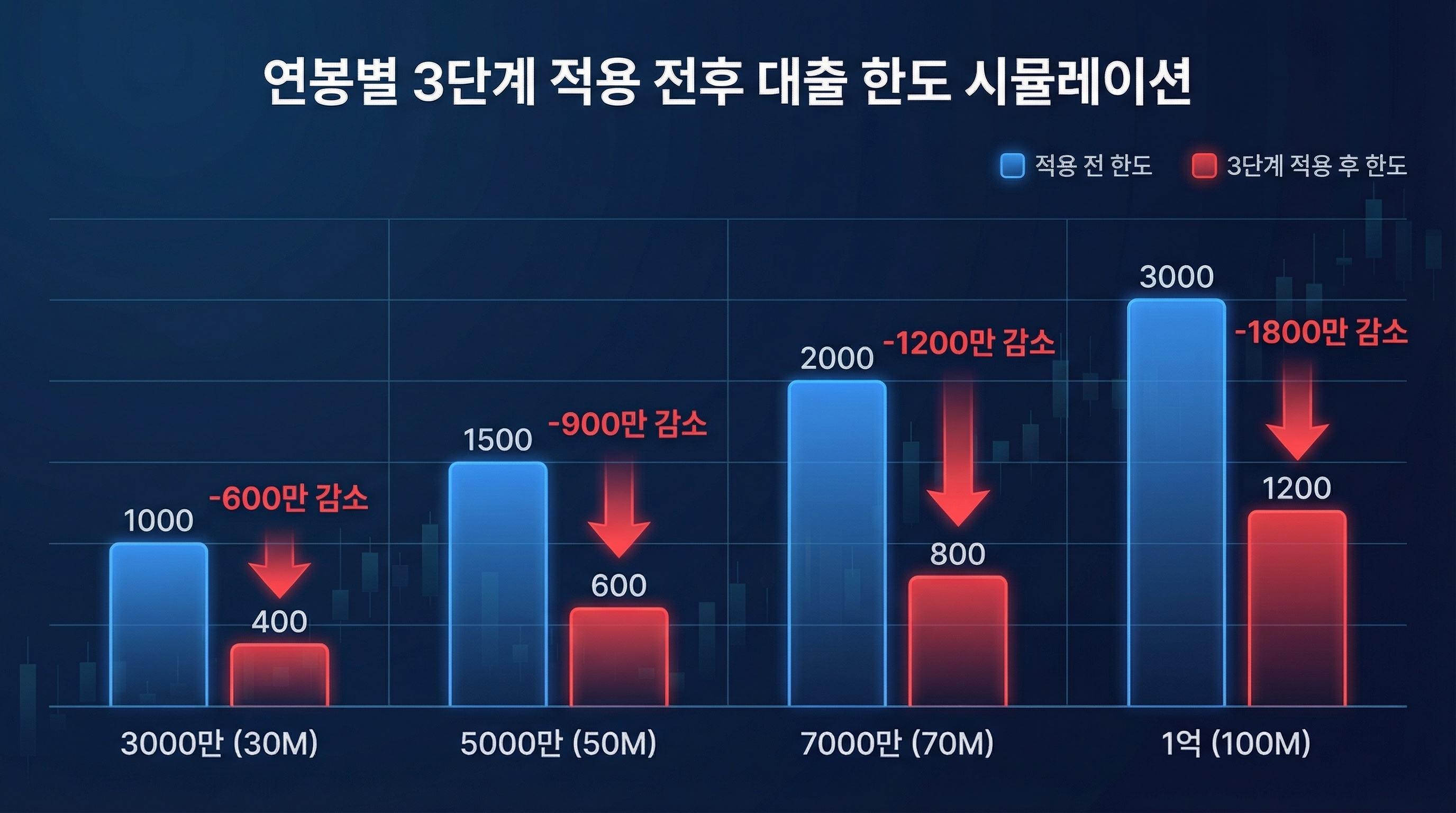 | 연봉 | 적용 전 한도 | 3단계 적용 후 | 감소 금액 |